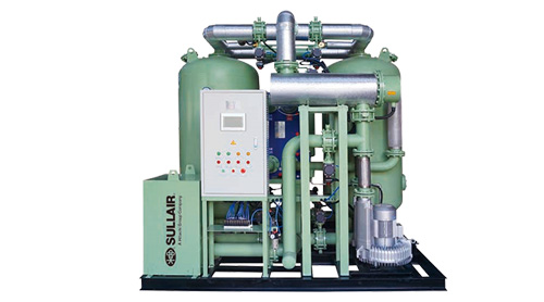 鼓风零气耗吸附式干燥机是在普通有气耗鼓风加热再生吸附式干燥机的基础上,增加中置水冷却器。由鼓风机吸入的空气经加热器加热后且已用于再生的这部分热空气会循环流经中置水冷却器和再生塔,通过连续的循环对再生塔进行冷却、降温。同时,该部分的再生空气在对再生塔进行循环冷却、降温的过程中自身的温度和湿度不断的降低和减少,从而将吸附床层的温度降低、吸附剂表面的水分进一步被带走。通过这个循环冷却的过程,再生塔内的吸附剂床层逐步达到满足进入吸附的条件,为下一步的吸附工作做好准备。